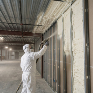 In commercial and industrial projects, spray foam insulation is commonly installed in large-scale areas to improve energy efficiency, air sealing, and moisture control throughout the building envelope.